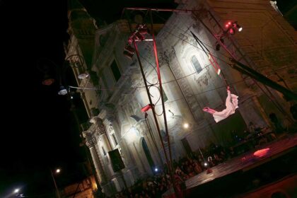 Il raffinato acrobata e trapezista argentino Adriano Cangemi presenta “Nagual – Mosso dal vento”, una rappresentazione di teatro fisico ed aereo costruita attorno a una struttura aerea con doppio trapezio oscillante, in grado di evocare un universo poetico sospeso tra cielo e terra. Lo spettacolo è in tournée dal 2018 ed è stato presentato in oltre 18 paesi in Europa, America Latina e Asia, con più di 250 repliche realizzate tra festival all’aperto ed eventi integrati.